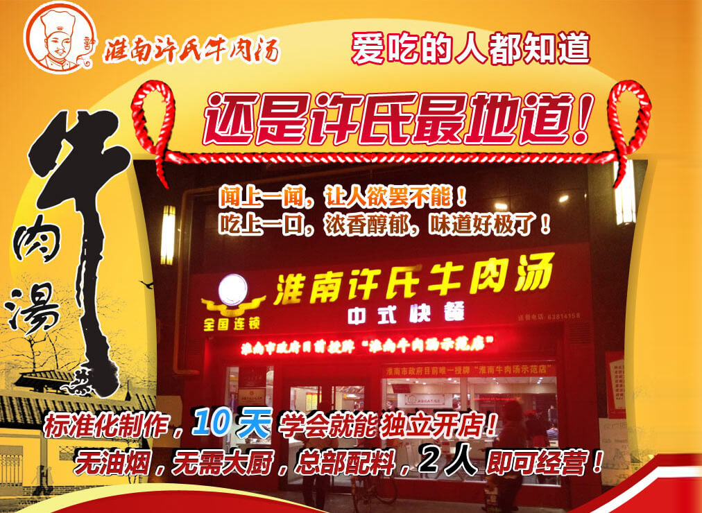 許氏淮南牛肉湯加盟專注制作快餐美食,種類之多,超出你的想象。搭配特色小吃和時尚飲品...